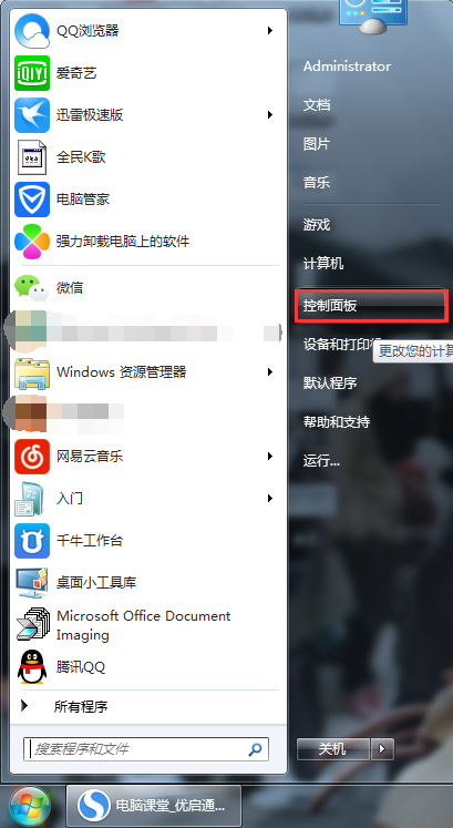 rn1、点击桌面左下角的“开始菜单”,选择“控制面板”,如图所示:rn