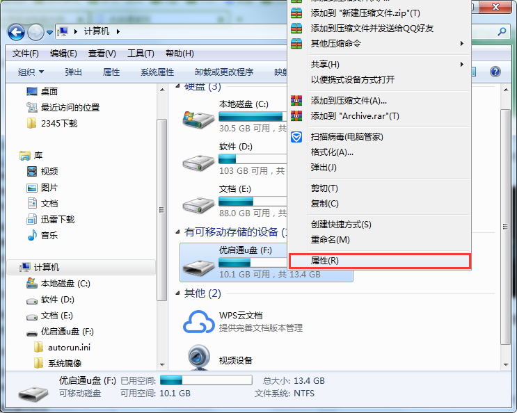 rn1、将您的U盘插进电脑的UDB接口,使其被读取;选择您的U盘(可移动磁盘),点击右键选择“属性”,如图所示:rn