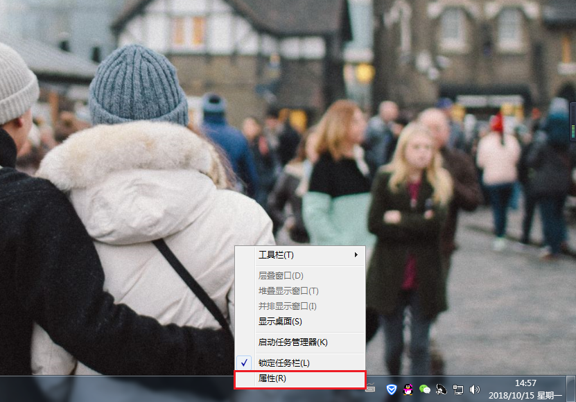 rn1、将鼠标置于任务栏空白处,点击右键选择“属性”,如图所示:rn