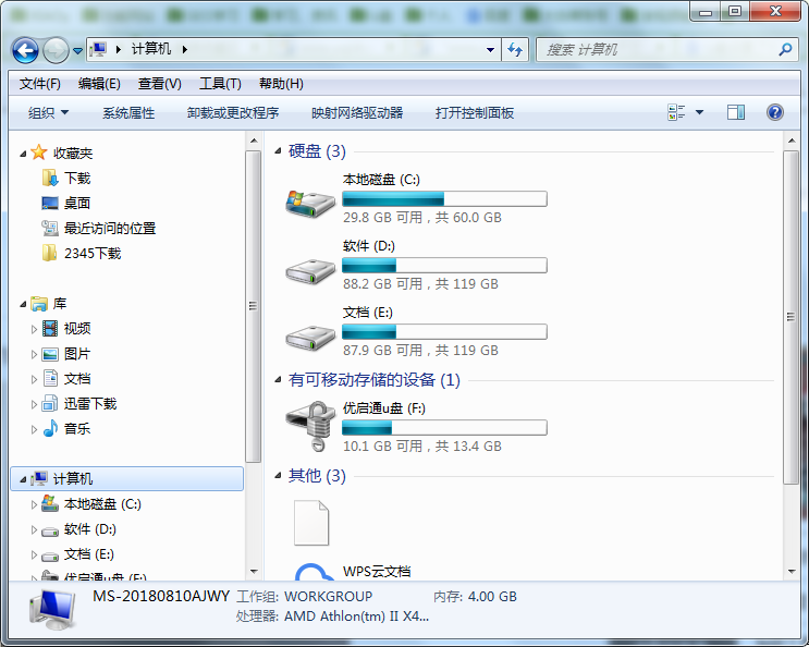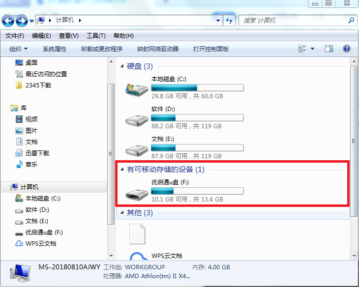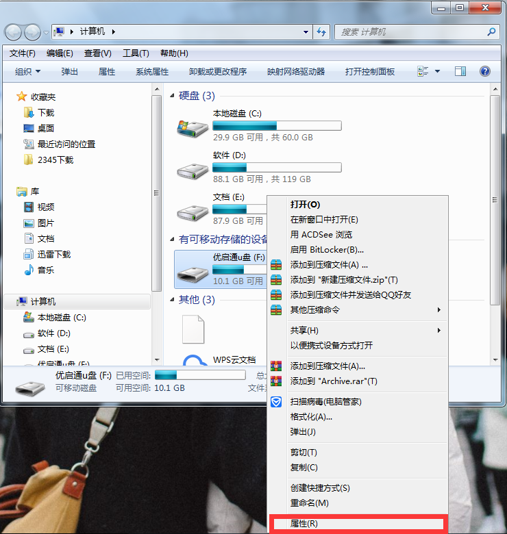 rn1、首先,打开桌面“计算机”图标,选择可移动磁盘(优启通U盘),右击选择“属性”,如图所示:rn