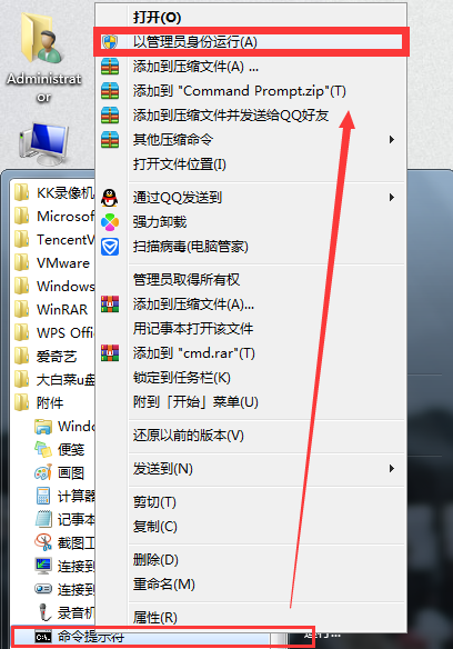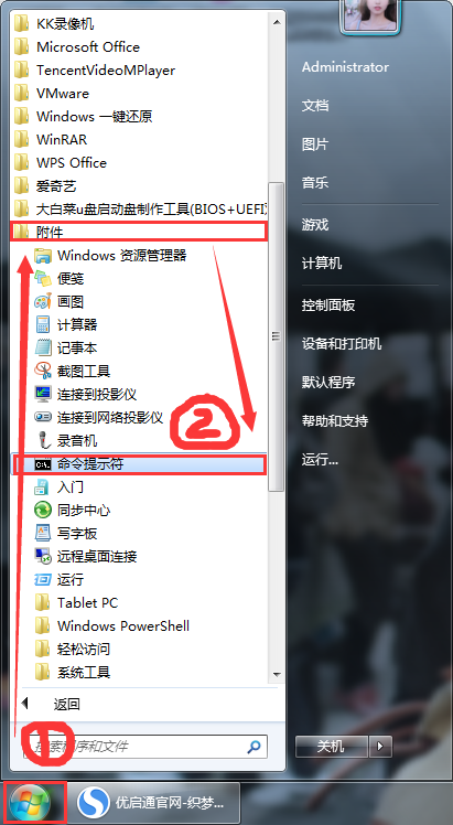 rn1、首先,点击桌面左下角“开始菜单”图标,选择“所有程序”下的附件“命令提示符”。如图所示:rn