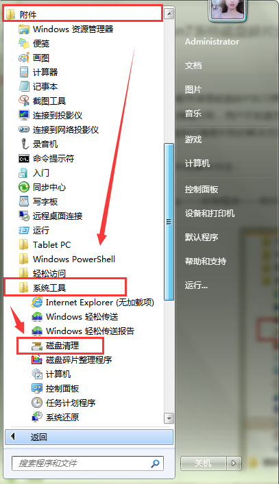 rn1、首先,点击桌面左下角的“开始菜单”,然后依次打开:“所有程序”——“附件”——“系统工具”——“磁盘清理”。如图所示:rn