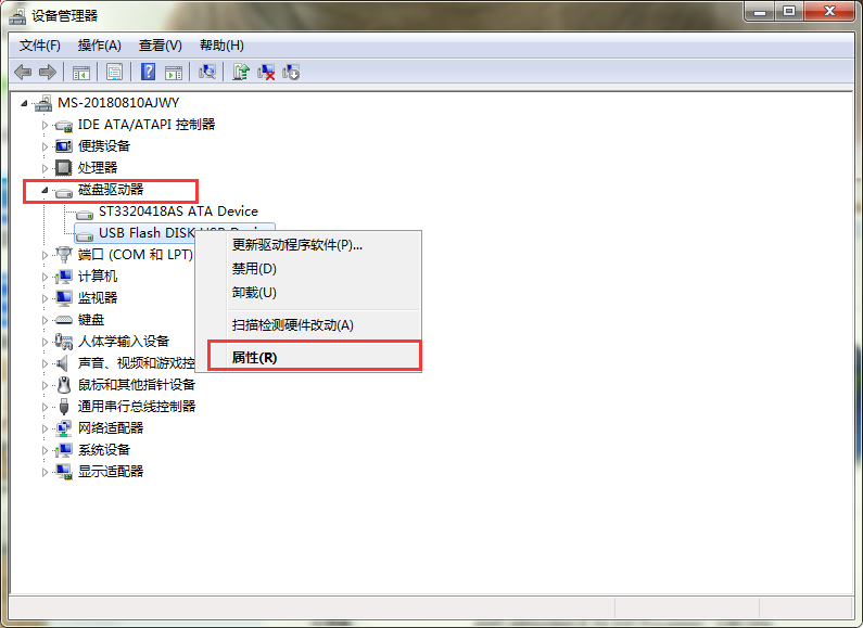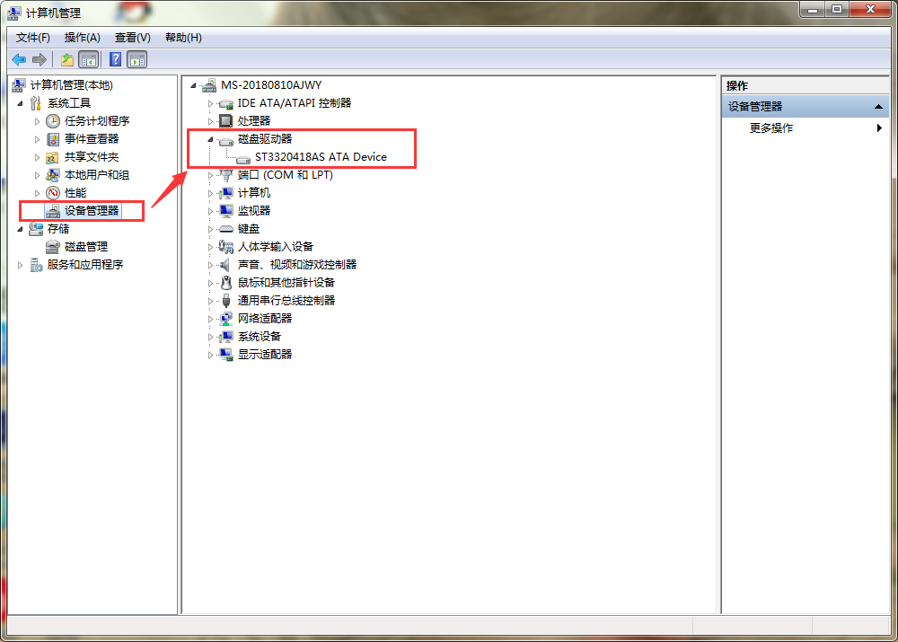 rn2、接下来,在打开的“计算机管理”窗口,依次选择“设备管理器”——“磁盘驱动器”——“ST3320418AS ATA Device”。如图所示: