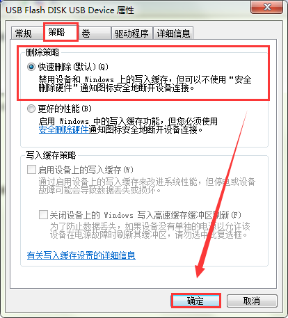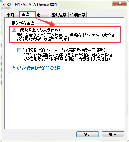 rn3、最后,在打开的“ST3320418AS ATA Device属性”窗口,勾选“启用设备上的写入缓存”即可。如图所示: