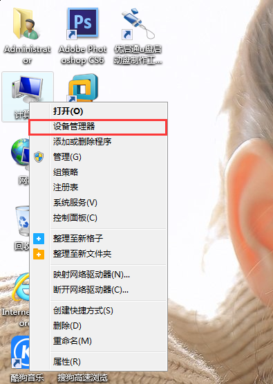 rn1、将鼠标置于桌面“计算机”图标上,按右键选择“设备管理器”。如图所示:rn