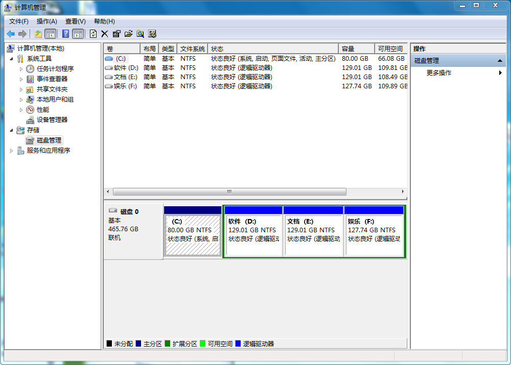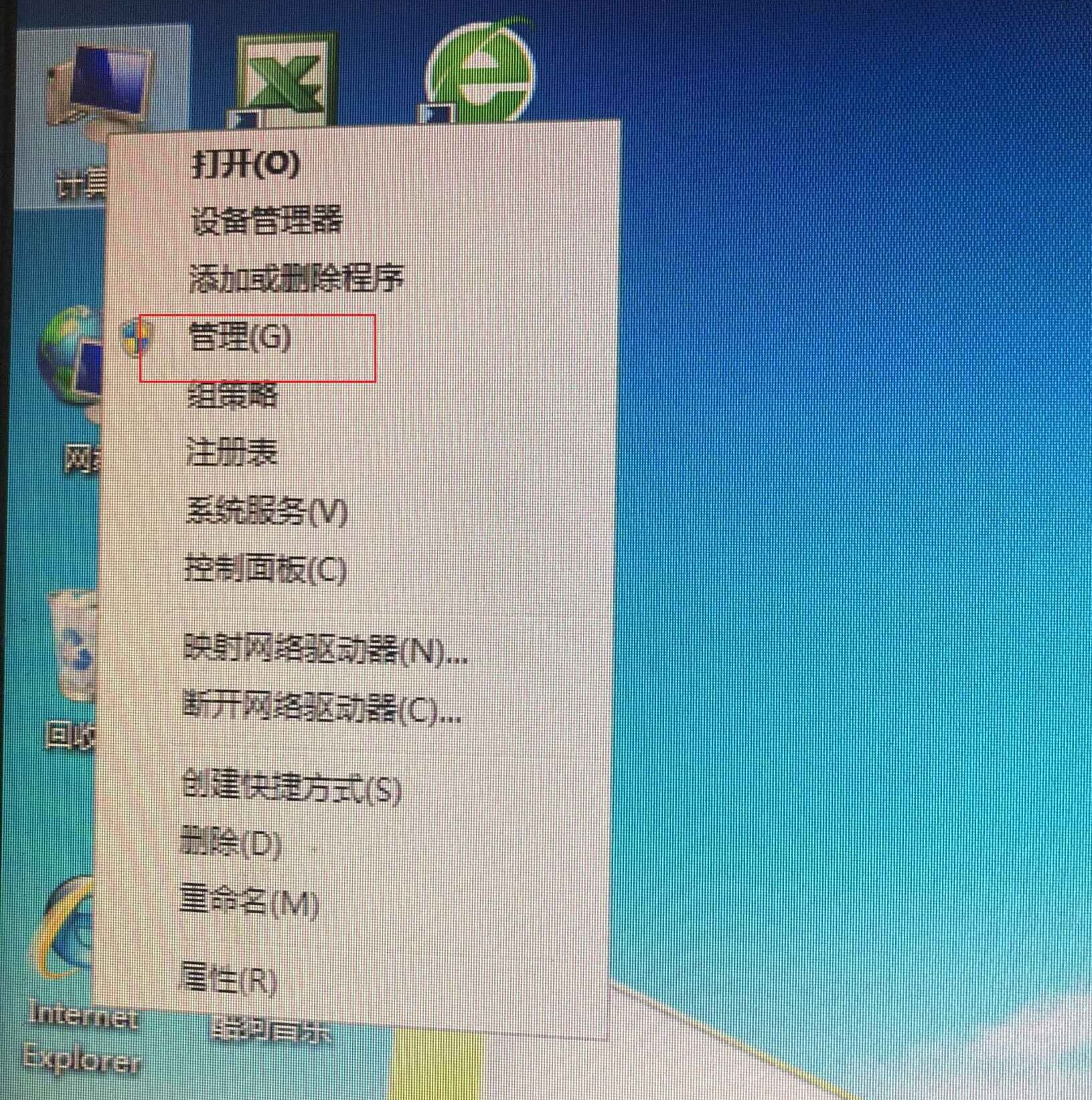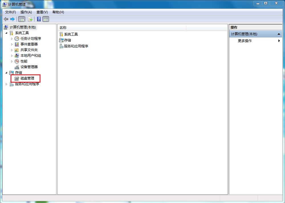 rn在桌面找到“计算机”图标,右击选择“管理”进入计算机管理界面后,点击“磁盘管理”: