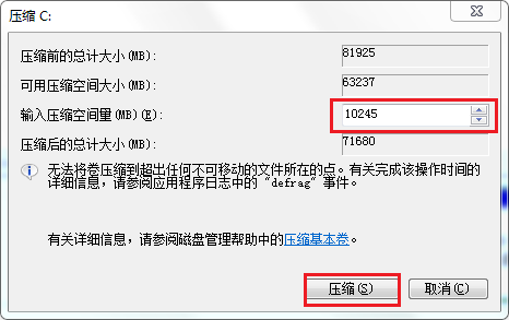 rn将计算好的大小输入到压缩空间量一栏,一定要确认无误以后再点击 “压缩”: