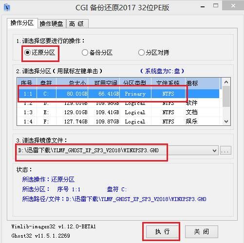 第四步:在弹出窗口中,镜像文件应为U盘中所准备的WINXP系统镜像,可参照下图方式选择,点击“执行”: rn