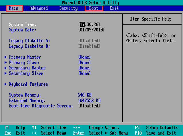 rn将选项卡从“Main”切换至“Boot”。如图所示:rn