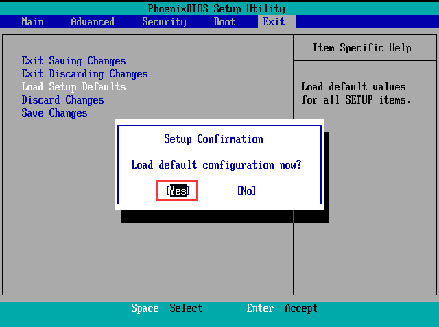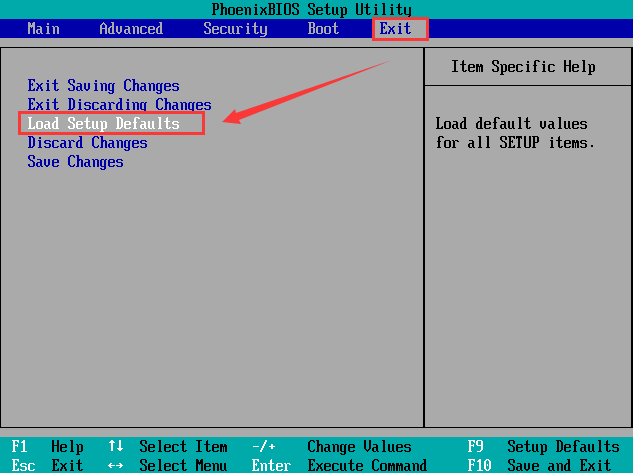 rn第一步:进入BIOS设置后,将选项卡切换至“Exit”,再按“↑”“↓”方向键选择到“Load Setup Dwfaults”。如图所示:rn
