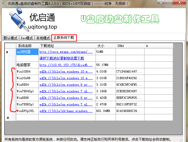 rn1、首先,双击打开“优启通U盘启动盘制作工具”,选择“正版系统下载”选项卡,选择您喜欢的系统镜像,点击下载地址。如图所示(以下小编以下载win 7 64位系统为例):rn